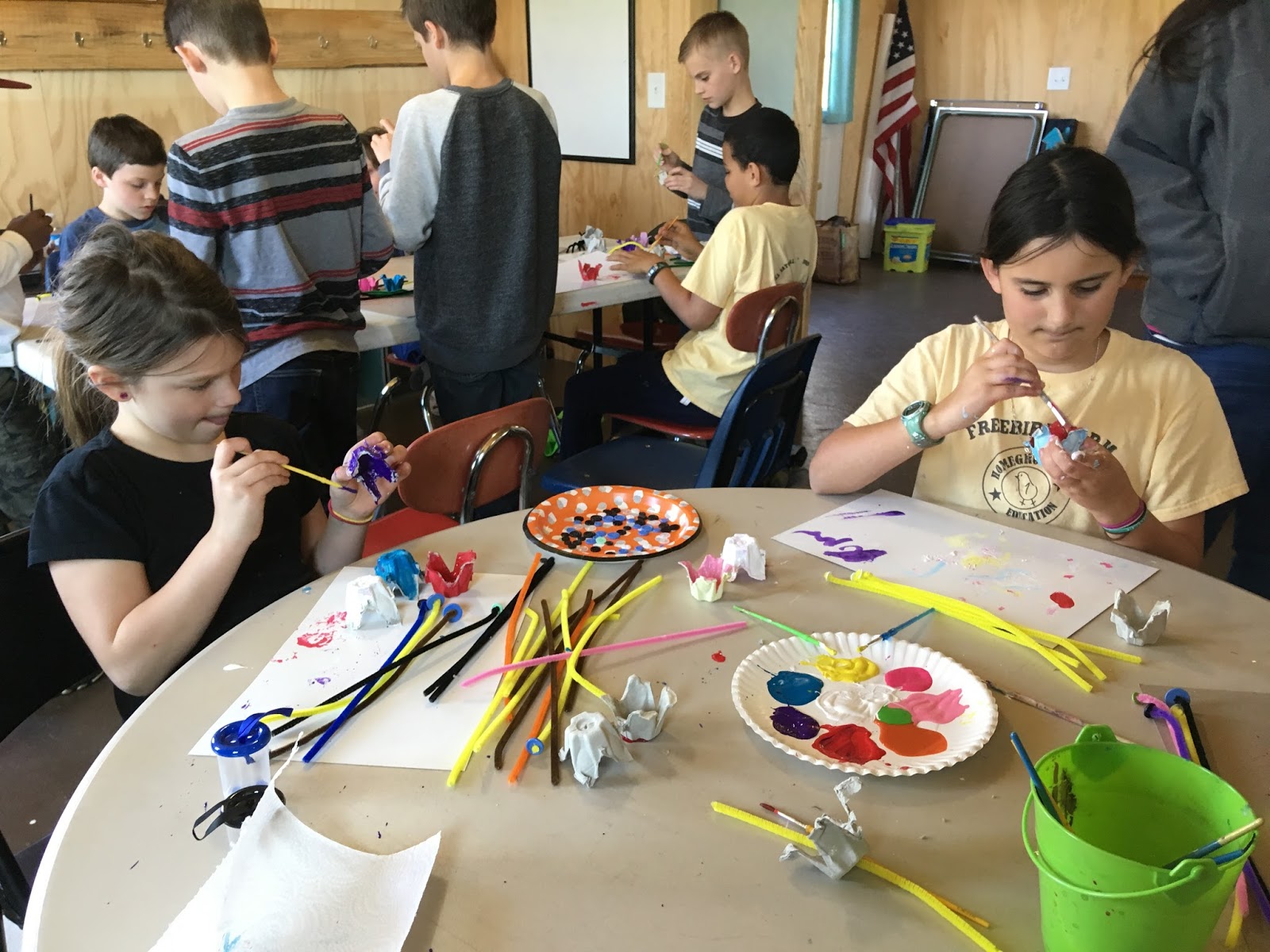 guineas lack spots, most colors of guineas have little white speckles. As they worked through these projects they learned about the guineas' origins in Africa, their defensive nature, the incubation of their keets (babies), and their crazy personality! At the end of the month, the class worked with yard to create fuzzy chicks to take home just in time for Easter!